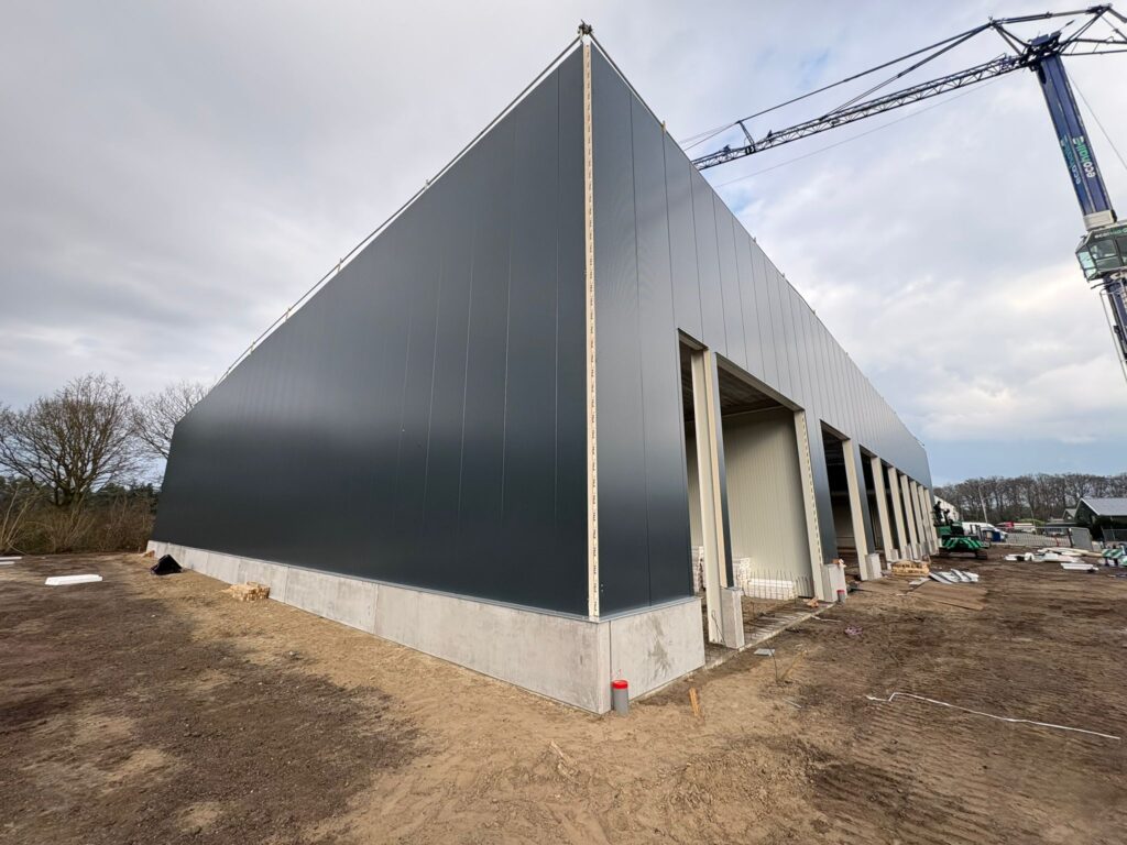 Eco Hall heeft een nieuwe bedrijfshal gebouwd in Stroe, gekenmerkt door twee industriële rolluiken, een…
